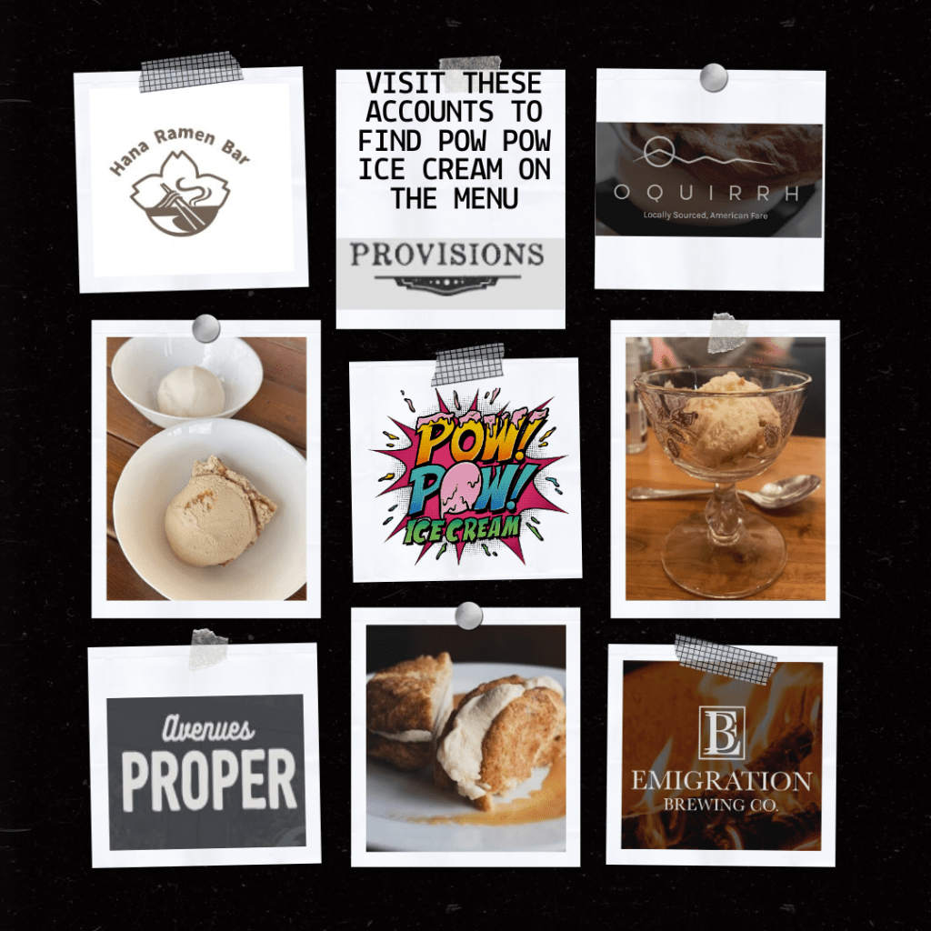 Pow Pow Ice Cream is custom made small batch ice cream. Our ice cream is inspired by local restaurants that help brainstorm and support our ice cream experiments.
